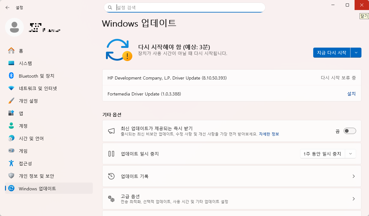 Windows 업데이트 설정 화면