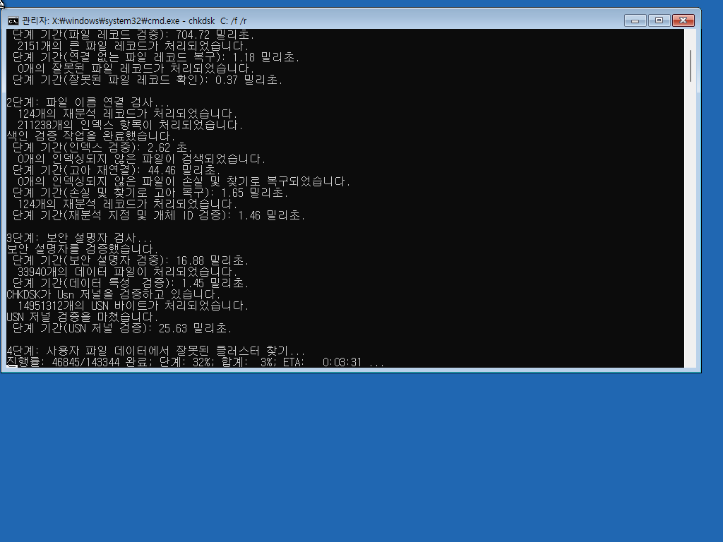 📌 배드섹터 검사 및 파일 시스템 오류 복구를 진행합니다.