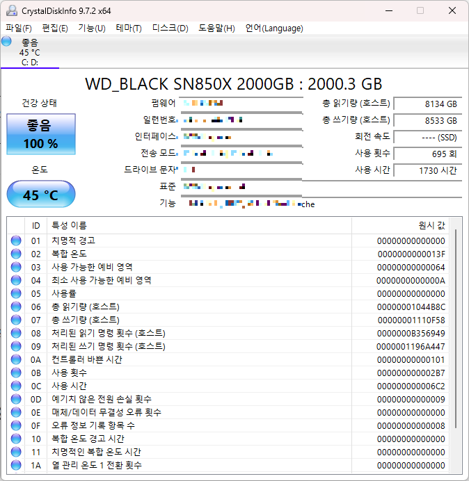디스크 점검 프로그램(CrystalDiskInfo 등)을 사용하여